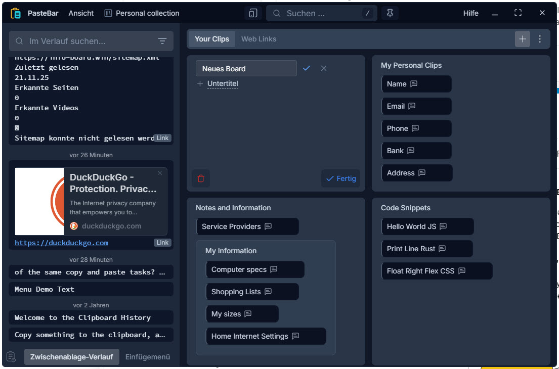 - Collections & Boards: Du kannst Snippets sortieren (z.B. „Marketing“, „Coding“, „Kunden“).