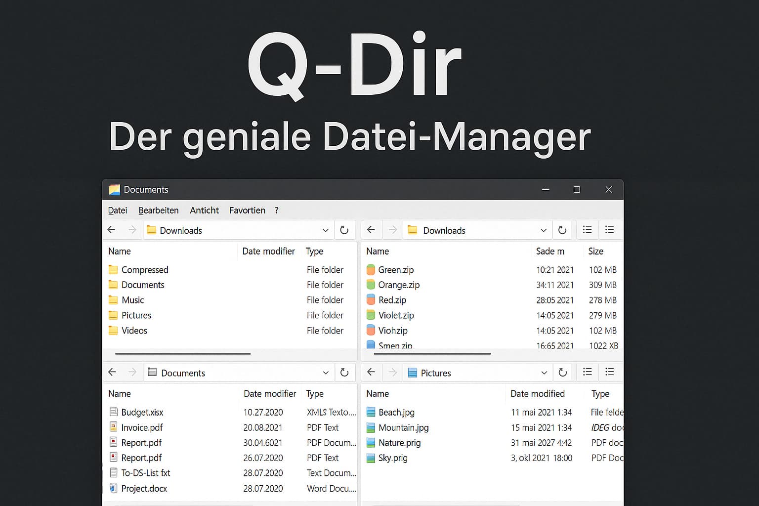 Das Prinzip: Du hast vier voll funktionsfähige Explorer-Ansichten in einem Fenster. Kein Alt-Tab mehr, kein Fenster-Schieben.